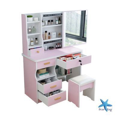 Столик оснащён большим прямоугольным зеркалом с LED-подсветкой, которая обеспечивает комфортное освещение для ежедневных бьюти-процедур. Благодаря продуманной конструкции с множеством открытых полок и выдвижных ящиков можно легко организовать хранение всех нужных предметов. Мягкий пуфик в комплекте дополнительно улучшает удобство использования